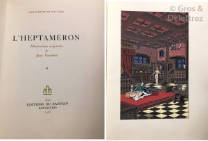 frontispices en double page de Jean Gradassi, rares rousseurs au début du tome 1, un feuillet de notes manuscrites contrecollée au contreplat de l’emboîtage. Tirage limité à 1000 exemplaires, un des numérotés sur Lana (n°777). - Victor HUGO. Notre-Dame de Paris. Monte-Carlo, Editions du Belvédère, sd (1950), 2 volumes in-8 en feuilles sous emboîtage, dos des chemises cartonnées doublés, une charnière fendue. Illustré d’aquarelles reproduites au pochoir, dont 24 hors-texte, par Jean Gradassi. Tiré à 700 exemplaires numérotés, un des 150 sur Annam de Rives contenant une suite en noir de tous les dessins. - Marguerite de NAVARRE. L’Héptaméron. Boulouris, Éditions du Baniyan, 1970, 2 volumes in-8 en feuilles sous double emboîtage. Illustrations originales en couleurs de Jean Gradassi, dont 15 hors-texte. Tirage limité à 500 exemplaires, un des 260 numérotés sur grand vélin de Lana.