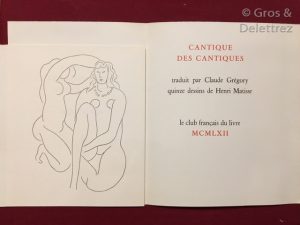 [MATISSE] Cantique des Cantiques. Traduction de Claude Grégory. Paris, Club français du Livre, 1962, in-8 en feuilles sous couverture rempliée et emboîtage. Illustré de 15 dessins de Henri Matisse. Exemplaire numéroté sur grand papier pur fil...