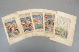 [Miniature Persane] Ensemble de cinq miniatures persanes peintes à la gouache et à l’or. Epoque début 19e. Deux miniatures représentent une scène de guerre, une autre, une scène de paix et une quatrième une scène d’offrande. Chaque...