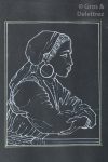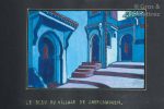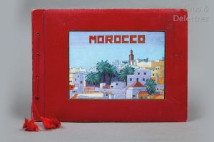 caravane de dromadaires et une carte, l’artiste a représenté diverses vues : un ksar (village fortifié), une mosquée à Rabat, la Médine à Tanger, la Vallée de Drâa, une vue de l’Atlas, le marché de Meknès, le village de Chefchaouen, Asilah, Rissani, Casablanca, Oued Massa, Essaouira, etc. On trouve aussi dans cet album des scènes ou personnages locaux : musicien, rituel du thé, céramique…, parfois dessinés seulement au trait gouaché de blanc. L’album de feuilles cartonnées noires présentent 29 gouaches en couleurs et 15 dessins ; il est de format in-4 oblong, relié en cuir avec une peinture titrée « Morocco » sur le premier plat.