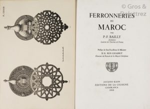 BAILLY (P.F.) Ferronneries du Maroc. Casablanca, 1950, album in folio sous portefeuille cartonné avec un rabat usagé, dos toilé. Illustré de 46 planches comprenant 214 motifs d’après les dessins originaux de P.F. Bailly, séparés en 2...