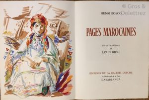 [RIOU] Henri BOSCO. Pages marocaines. Casablanca, Ed. de la Galerie Derche, 1948, in-4 en feuilles sous couverture rempliée légèrement insolée, chemise et étui recouverts de raphia. Illustré de 40 gouaches originales, dont un frontispice et 17...