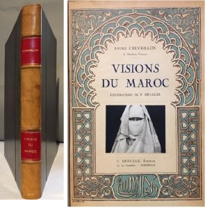 André CHEVRILLON. Visions du Maroc. Marseille, 1933, in-4 relié demi-basane, couverture conservée. Illustré de très nombreuses photographies de F. Detaille. Un des 200 exemplaires de tête sur Arches (n°118).