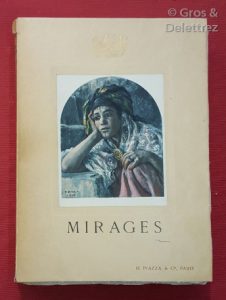 Etienne DINET et Sliman Ben IBRAHIM. Mirages. Scènes de la vie arabe. Paris, Piazza 1906, in-8 broché, couverture illustrée. Illustré de compositions en couleurs d’Etienne Dinet commentées par Sliman Ben Ibrahim Bamer. Tiré à 400 exemplaires...