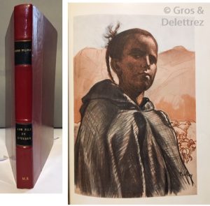 initialement illustré par de Montorient mais a finalement été offert aux pinceaux d’Henri Pontoy. Tiré à 550 exemplaires, celui-ci sur Vélin de Rives (n°129), enrichi d’un envoi de l’auteur. Ces récits excellemment rendus par Euloge et Pontoy ont pour théatre l’Atlas méridional marocain, le pays des Aït Oumalou, fils de l’ombre comme ils se désignent eux-mêmes.