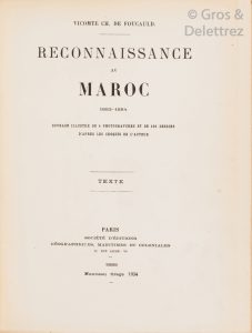 l’auteur. Le texte est suivi d’un atlas de 20 cartes doubles, une dépliante et une d’assemblage, toutes montées sur onglets. En 1883, Charles de Foucauld quitte l’armée, s’installe à Alger et fonde le projet d’un voyage au Maroc, pays, à l’époque, peu fréquenté par les européens. Il apprend l’arabe et l’hébreu et décide de partir à l’aventure, déguisé en juif marocain, s’assurant toutefois de la présence d’un guide israélite, le rabbin Mardochée. Le voyage durera près d’un an, du 29 juin 1883 au 23 mai 1884. Rentré en France, Foucauld entreprend la rédaction de ses notes qu’il avait pu prendre sur les tribus marocaines, le pays, ses rivières, et ses routes. Il donne aussi ses observations astronomiques faites au cours du voyage, ainsi que des renseignements sur la météorologie, et même une étude statistique sur les israélites au Maroc. Le livre sera publié en 1888, et demeure la source de renseignements la plus précieuse et la description la plus large qui ait jamais été tracée du Maroc.