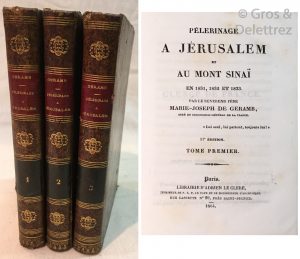 Marie-Joseph de GERAMB. Pélerinage à Jérusalem et au Mont Sinaï en 1831, 1832 et 1833. Paris, Le Clere, 1864, 3 volumes in-12 reliés pleine basane racinée, dos lisses ornés de filets et de fleurons dorés, double pièce de titre, petit accroc...