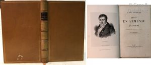 orné, roulette intérieure, illustré d’un portrait de l’auteur. Page de titre piquée, petit travail de ver sur un plat. Exemplaire truffé d’une lettre autographe signée de l’auteur à Sédillot qui a fait sa notice biographique. Amédée Jaubert, orientaliste, fut interprète de Napoléon en Egypte, avant d’être envoyé en Iran pour asseoir la position de la France dans le pays. Sa relation de voyage décrit de nombreuses contrées qui n’avaient jamais été visitées jusque là, par les européens.