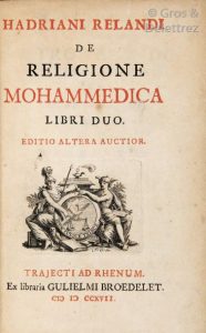 Hadrian RELAND. De Religione Mohammedica. Brodelet, 1717 in-12 relié plein veau, dos à nerfs orné, petit accident en bas du dos. Illustré de 4 grandes planches dépliantes, de 2 vignettes dont 1 de titre et d’un titre frontispice par Goeree...