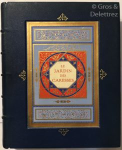Franz TOUSSAINT. Le Jardin des Caresses. Paris, Piazza, sd, in-4 relié plein chagrin bleu nuit, dos à nerfs, titre enluminé en couleurs mosaïqué sur le premier plat, tête dorée. Illustré de 12 enluminures par V.L. Noguères, et...