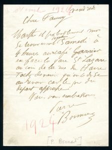 Lettre autographe signée à Fanny. [Paris], Vendredi [novembre 1924 ?]. 1 page bi-feuillet in-12. Sur le point du départ : « Marthe et probablement moi se trouveront demain samedi à 4 heures au café Garnier en face de la gare St-Lazare au coin de la rue du Havre. Tachez de venir qu’on se dise au revoir car le jour du départ approche… »