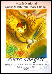 Affiche lithographiée de L'Ange du jugement avec signature autographe Marc Chagall, 1976, par Charles Sorlier (1974), 76 x 51 cm. Affiche réalisée pour l’exposition « Maquette pour l’œuvre monumentale » au Musée National Message Biblique Marc Chagall de Nice ; imprimée par Mourlot.