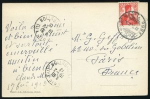 Rare carte de son unique séjour en Suisse Claude Monet fit de nombreux voyages à travers l’Europe mais ne séjourna qu’une seule fois en Suisse, en février 1913, en compagnie de son épouse et des enfants de Suzanne et Théodore Butler. Il s’était promis d’y revenir pour y peindre mais les années de guerre qui allaient suivre ne lui en donnèrent jamais l’occasion.