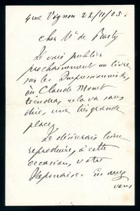 À propos de son Histoire des peintres impressionnistes publiée la même année : « Je vais publier prochainement un livre sur les Impressionnistes, où Claude Monet tiendra, cela va sans dire, une très grande place. Je désirerais bien reproduire, à cette occasion, votre Japonaise, en avez-vous une photographie, dessin ou reproduction sous forme quelconque, que vous pourriez m’envoyer ? Je serais heureux de voir figurer cette belle œuvre de Monet dans mon livre… »