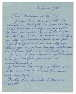 « Je viens de recevoir une lettre du Cabinet du Ministre des Beaux arts avec le questionnaire d’usage concernant la Croix ; en même temps Gertrude Stein m’écrit que Monsieur Maratier l’informe que cette nomination serait chose faite, il lui dit également que vous allez enfin obtenir ce que vous désirez relativement au tableau destiné au Luxembourg... Je travaille beaucoup, j’espère que notre exposition en novembre sera assez importante [l’exposition Picabia à la galerie Vignon, Paris 1933]… »