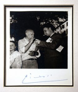 Photographie en noir et blanc, avec signature autographe à l'encre bleue, dans la marge, sous la photo. 13 x 10,5 cm, bien encadrée sous verre.