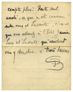 Lettre autographe signée deux fois de son monogramme, adressée à Camille Pissarro. S.l., Dimanche soir [6 novembre 1892]. 3 pp. in-4 (21 x 27 cm). « Mon cher maître, j’espérais vous voir aujourd’hui: c’est pour ce, que je vous préviens si tard de l’heure de la cérémonie: Demain, lundi, 4 heures du soir, mairie du XVIIIe (montmartre, au bout de la rue Clignancourt… »