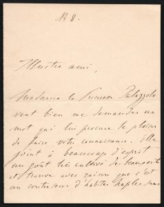 Lettre autographe signée. Rome, 1er janvier 1866, à son Illustre ami [le pianiste Sigismund Thalberg]. 2 pp. in-12, 16 lignes à l'encre noire. Second feuillet, vierge, partiellement détaché. Message de recommandation croisée, écrit dans un français des plus recherchés par le pianiste et compositeur d'origine hongroise : « Madame la Princesse Palazzolo veut bien me demander un mot qui lui procure le plaisir de faire votre connaissance. Elle joint à beaucoup d'esprit un goût très cultivé des beaux-arts et trouve avec raison que c'est un contresens d'habiter Naples sans vous voir... », ce qui est bien le cas du virtuose S. Thalberg.