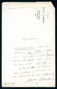 Lettre autographe signée à Madame ***. Paris, jeudi soir (s.d.). 1 page bi-feuillet in-8, en-tête des Bouffes-parisiens en coin. Adressant un rendez-vous