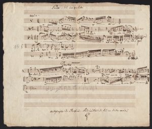 « Fassi di Capuletti », « Aria » et « Duetto », extraits musicaux tirés de l'Opéra de Vincenzo Bellini Les Capulets et les Montaigus. Manuscrit musical autographe signé. S.l.n.d [c. 1835]. 1 page in-4, à l'encre noire. Très belle page de « nomenclature musicale », d'une écriture assez relâchée, à travers laquelle Rossini donne les Incipit musicaux ou certains « morceaux de bravoure » (2 à 3 mesures) tirés des airs fameux composés par Bellini pour son opéra Les Capulets et les Montaigus créé en 1830. Son titre « Fassi di Capuletti » pourrait se traduire par « Concentrés de Capulets » qui consistent en des extraits, vocalises et ornements de 6 numéros d'Aria, et d'au moins un Duetto, dont le maître de Pesaro ne termine pas la rédaction (quelques notes au crayon noir, et d'une autre main en marge inférieure « Autographe de Rossini, Pièce inédite de lui et de sa main »).