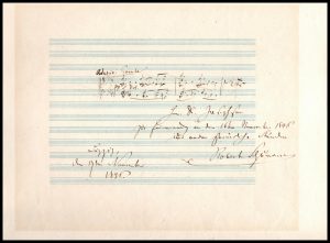 Double citation musicale autographe signée. Leipzig, 14 novembre 1846, au recto p.a.s. de Robert Schumann (1810-1856) et au verso p.a.s. de Clara Wieck, épouse Schumann (1819-1896) d'un feuillet grand in-4, à l'encre noire (nom du dédicataire non déchiffré). Superbe témoignage de tournée des époux Schumann
