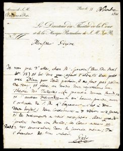 Lettre autographe signée à Monsieur Grégoire, datée 11 novembre 1810. 1 page in-4, à l'encre noire. Très bel état. Alors « Directeur du Théâtre de la Cour, au service de Sa Majesté L'Empereur et Roi », Paër invite son correspondant à « se rendre chez Spontini pour organiser deux répétitions de Nina ».