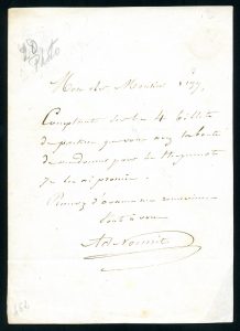 Antoine PONCHARD (1787-1866), de l'Opéra-Comique. Lettre autographe signée à Monsieur le Baron de la Ferté. Paris, 1823. 1 page à l'encre noire ; Adolphe NOURRIT (1802-1839). Pièce autographe signée à Monsieur de Luzy, de l'Opéra, 4 lignes à l'encre noire. Interprète de Grétry, Boïeldieu, Isouard et Auber, professeur de chant au Conservatoire de Lille, Antoine Ponchard écrit à l'Intendant du Roi pour obtenir un congé.