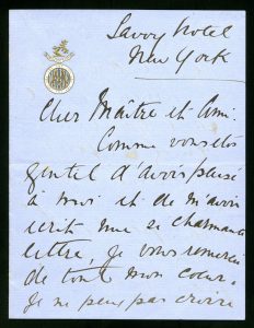 Trois lettres autographes signées à l'encre noire, c. 1895-1925. Superbe lettre de la soprano australienne Nelly MELBA (1861-1931) à Jules Massenet, 1895, 6pp. Elle reprend le rôle de Manon à Londres en 1896 - Belles lettres d'Emma CALVÉ (1858-1942), c. 1904, 1 p. ½ : « De tout cœur et avec plaisir, je chanterai le 1er juillet à l'Ambassade... » et de Mary GARDEN (1874-1967) à Lucien Muratore, n.d., 4 pp. Elle évoque Rachmaninoff et Mozart.