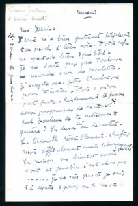 Lettre autographe signée à Denise Duval. S.l.n.d. [Noizay, c. 1960], un feuillet in-4, deux pleines pages écrites à l'encre bleue. Bel état. Superbe lettre à la soprano française (1921-2016), la créatrice de sa Voix humaine en 1958.