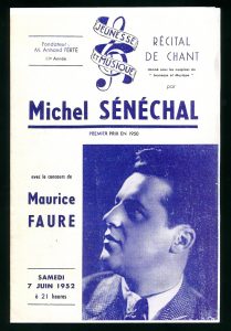 Correspondance professionnelle. 20 lettres autographes signées à lui adressées par des professeurs, musiciens et compositeurs, 1948-1956. Engagements, conseils, félicitations, mises en garde : c'est toute la première partie de la grande carrière de Michel Sénechal que l'on retrouve ici : 2 lettres et cartes de visite autographes signées de ses professeurs au Conservatoire Madame Louise Matha de PARREL et Madame Jean VUILLERMOZ (1948/49), une l.a.s. du directeur du Théâtre Édouard VII (1 page, 1948), une belle lettre de son maître Gabriel PAULET (2 pp. in-4, 1950), une p.a.s. de Jacques CHAILLEY pour un engagement (1950), une carte de visite autographe signée d'André MESSAGER (1950), une l.t.s. de René BERTHELOT alors directeur du Conservatoire d'Orléans (1 page, 1950), deux très belles l.a.s. de son professeur Salvatore SALVATI (4 pp. à l'en-tête « Maestro Tenor », 1952/53), une l.a.s. de Georges DANDELOT, une c.a.s. de Gabriel Dussurget (répétitions à Aix, 1952), 7 l.a.s. de la Marquise de Peyrebère de GUILLOUTET, déléguée artistique du Consulat à Salzbourg (1953-1956, à l'enthousiasme des premières lettres succède une fâcherie exprimée plus rapidement...).