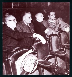 Joint : le contretype d'une superbe photo réunissant Louis Beydts, Maurice Lehmann, Jean Périer et Jacques Janssen, prise pendant les répétitions de Pelléas (production de 1952). On aperçoit derrière eux la fille de Claude Debussy, dame déjà âgée...