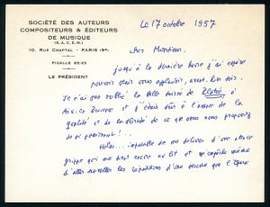 On recense : une lettre tapée signée du chef Hans ROSBAUD, une courte l.a.s. du pianiste Jacques FÉVRIER, des lettres ou cartes autographes signées des compositeurs Georges AURIC (20 lignes, il « n'a pas oublié la soirée de Platée à Aix »), Jean FRANCAIX (2 l.a.s., dont une avec large citation musicale jointe), Georges DANDELOT (1 pleine page), Maurice YVAIN (p.a.s. octobre 1957, « navré de ne pas avoir pu assister a votre grand succès... ») et 2 l.a.s. de Jean-Louis VAUDOYER à propos de Gounod..