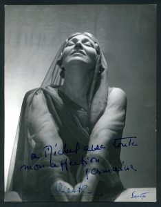 Joint : une remarquable photographie, portrait inspiré de la soprano dans Alceste (Lipnitzki, 1967, noir et blanc, 24 x 32 cm), avec une belle dédicace à M. Sénéchal.