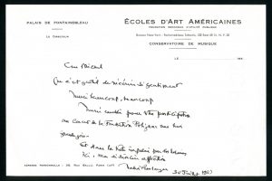 Nadia BOULANGER (1887-1979) : 2 cartes de visite a.s. (quelques lignes autographes, vœux pour 1957), un beau mot d'amitié (1 p.a.s., 30 juillet 1969) et une lettre du secrétariat du Conservatoire de Fontainebleau (1 page, janvier 1977).