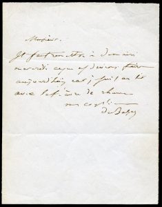 Billet autographe signé adressé à Monsieur Potter, 38, rue St Jacques. [Paris, s.d.]. 1 page in-16. Adresse autographe au verso, vestige de cachet de cire rouge. « Il faut remettre à demain mercredi ce que nous devions faire aujourd’hui, car je suis au lit avec la fièvre et le rhume… »