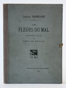 Un vol. in-8, 9 eaux-fortes en feuilles, sous chemise cartonné éditeur, lacets d’attaches (reliure de l’éditeur). Suite complète de 9 compositions surréalistes de Redon, réalisées en héliogravures par le procédé de Léon Evelyn. Les dessins de Redon avaient été acquis par l’éditeur Deman au salon de Bruxelles en 1890 ; ils devaient illustrer une édition des Fleurs du mal qui n’a jamais paru. Il s’agit ici du second tirage en réduction qui parut à 100 exemplaires et d'un des 80 exemplaires sur vélin (n°4).