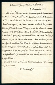 Lettre autographe signée adressée au directeur de la revue anglaise The Colosseum. Clamart, 9 novembre [1933]. 1 page in-8 ; en français. Il l’autorise à traduire et publier le supplément de son livre Der Sinn der Geschichte [le Sens de l’Histoire] intitulé Der Will zum Leben und der Wille zur Kultur [La volonté de vivre et la volonté de culture].