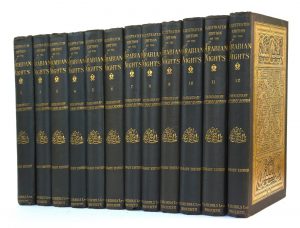 Traduit de l’arabe par le Capitaine Sir R.F. Burton. Réimpression éditée par Leonard C. Smithers, illustrée d’une suite de 71 illustrations originales reproduites d'après des huiles originales d’Albert Letchford. Londres, H.S. Nichols, 1897. 12 vol. in-8, nombreuses illustrations, pleine percaline marine orné d’arabesques et motifs arabes (reliure de l’éditeur).