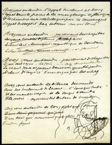 Rare manuscrit poétique de jeunesse. 6 pp. in-4, quatre à l’encre noire sur feuillets de papier vélin et deux au crayon sur un feuillet de cahier d’écolier. Manuscrit orné de 7 dessins originaux à l’encre. Beau manuscrit poétique comportant de nombreuses variantes et enrichi de dessins