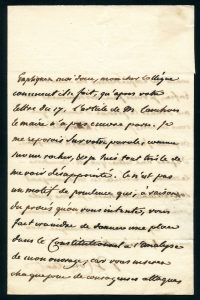 Deux lettres autographes signées à M. Jay. Ce 16 9bre 1825 et s.d. 4 pp. sur bi-feuillet, in-8, adresse au verso. À propos d’un article de M. Cauchois-Lemaire, que son libraire demande de faire insérer dans le Constitutionnel, puis se plaignant qu’il ne soit pas encore paru : « …Je le lui donne d’autant plus volontiers que je suis convaincu que l’article est excellent en lui-même et que son insertion aura pour moi l’avantage de me faire connaitre l’opinion d’un homme très éclairé sur mon livre, indépendamment de la publicité additionnelle que ce livre devra au journal le plus répandu et le plus accrédité de France... Je me reposais sur votre parole comme un rocher, et je suis tout triste de me voir désappointé. Ce n’est pas un motif de prudence qui, à raison du procès qu’on vous intente, vous fait craindre de donner une place dans le Constitutionnel à l’analyse de mon ouvrage ; car vous insérez chaque jour de courageuses attaques...