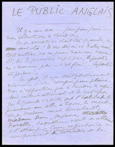 Le public de Londres est assez différent du public de Paris. D’abord il m’a semblé qu’il n’avait pas de prétention. Ce qui est une charmante qualité et un sérieux avantage sur le public parisien… Il pense – et combien il a raison de le penser ! – il pense que l’auteur a fait, et les artistes vont faire, l’impossible pour lui être agréable…