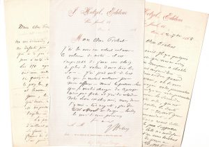 Correspondance avec Léon Laurent-Pichat, 83 lettres autographes signées. Bruxelles et Paris, c. 1857 à c. 1875, de 1 à 4 pp. in-8 pour chaque lettre écrite à l'encre noire. Excellent état général. Exceptionnelle correspondance qui réunit deux figures majeures de la presse et de l'édition du milieu du XIXème siècle.