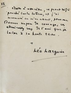 Manuscrit autographe signé intitulé Fernand Gregh comportant ratures et corrections. Petit in-4 carré, 12 pages écrites à l’encre au r° seul, demi-parchemin à la Bradel, auteur et titre dorés en long au dos. Éloge du poète et critique littéraire Fernand Gregh (1873-1960), proche de Marcel Proust dont il fit paraître les premiers écrits poétiques, par son confrère parisien Léo Larguier (1878-1950), qui fut l’un des piliers du monde littéraire de Saint-Germain-des-Prés.