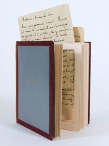 Deux lettres autographes signées [à Méry Laurent, 1893 et 1894], présentées sous une reliure petit in-12 carré, plein maroquin vieux-rose, dos lisse, titre doré au dos et au plat supérieur, le nom de l’auteur au dos, étui [Alix]. « Valvins, Dimanche soir [3 septembre 1893]