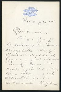 Lettre autographe signée Anna adressée à son Cher ami. Champlâtreux, 21 décembre 1913, Dimanche soir. 1 page in-8, en-tête imprimé. Anna de Noailles fait part du décès de sa belle-mère