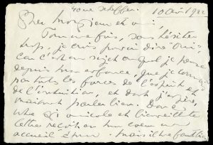 Lettre autographe signée adressée à un Cher Monsieur et ami [Arthème Fayard ?]. Paris « 40, rue Scheffer. 10 août 1922 ». 2 pp. in-8 obl. « … Pour une fois, sans hésiter trop, je crois pouvoir dire “oui” car c’est un sujet auquel je pense depuis mon enfance, que je connais par toutes les forces de l’esprit et de l’intuition, et dont j’espère vraiment parler bien. Donc votre si amicale et bienveillante lettre reçoit en mon cœur un accueil ému. Mais il me faudrait organiser, diviser, classer ce travail. J’aime faire le mieux possible ce que je fais. C’est ma manie et je souhaiterais que ce petit livret composé de “vos” chapitres donnât toute ma connaissance innée et enrichie par l’étude, l’expérience, l’observation de la poésie telle que je la crois à la fois mobile et éternelle. Seuls les vers libres (cela ne vous fâche pas ?) ne me semblent pas devoir être rangés sous le vocable si net et exclusif de “Poésie”… »