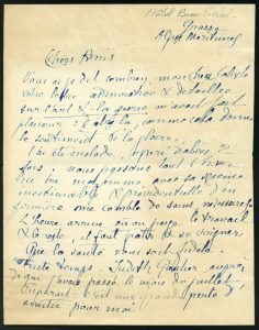 Lettre autographe signée Peladan adressée à ses Chers Amis [Paul et Calixte Placide]. Hôtel Beau Soleil. Grasse, [décembre 1917]. 1 page ½ in-4, légère décoloration. Lettre crépusculaire du Sâr Peladan, malade, évoquant la disparition de Judith Gautier