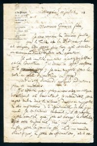 Lettre autographe signée aux éditeurs Garnier frères. Conciergerie, 10 juillet 1851. 2 pp. ¼ bi-feuillet in-8, en-tête en coin de son journal La voix du Peuple (coupé). Concernant la publication de son dernier ouvrage (Idées générales de la Révolution…)