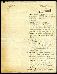 Manuscrit autographe Chroniquettes. S.l.n.d. 2 ff. in-4 sur papier quadrillé, quelques ratures avec ajouts. Article intitulé La Réclame que Jules Renard fera paraitre sous la rubrique Chroniquettes dans la revue Le Cri de Paris. Il présente le jeune auteur Pierre Sales : « Écoutez ! Écoutez ! cet écrivain… - Quel écrivain ? – Cet écrivain, dit Figaro, connait à merveille les mœurs de la société contemporaine ; il a le don d’observer ; il a la fécondité. Il a une imagination prodigieuse et une sensibilité prodigieuse aussi… Les caractères essentiels de son œuvre sont la simplicité, le naturel, la grandeur, la puissance, la santé, la force. C’est de l’art et du meilleur, car il… - Mais qui ? qui donc ? - … continue les traditions impeccables de Balzac… »