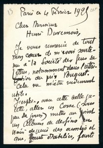 Joint : Une lettre autographe signée adressée à Henri Duvernois. Paris, 4 février 1925. 2 pp. in-12. Il le remercie pour son soutien pour l’attribution du prix de la Société des Gens de Lettres et « espère, avec cette belle galette, aller en Corse… »